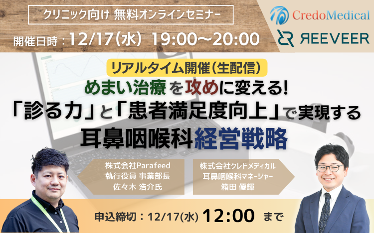 本セミナーでは、最新のVR検査機器「PitEye」を提供するParafeed社 佐々木様をお迎えし、耳鼻咽喉科クリニックの経営コンサルティングを専門とするクレドメディカルが対談形式で、「診る力」と「経営力」を高める新たな視点をご提案します。